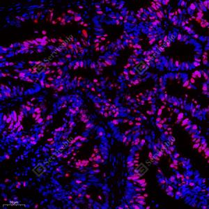 IF检测Ki67蛋白(货号 GB121141)(红色). 样品: 人结肠癌, 4%多聚甲醛 (货号G1101) 固定12-24小时. 抗原修复: 柠檬酸抗原修复液(干粉, pH 6.0) (G1201), 高压锅均匀喷气计时2分钟. 封闭: 3% BSA(货号GC305010)的PBS溶液, 室温孵育30分钟. —抗: 1: 500稀释, 4℃ 孵育过夜. 二抗: Cy3标记山羊抗小鼠IgG (H+L) (货号GB21301), 1: 300稀释, 室温孵育1小时. |