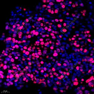 IF检测Ki67蛋白(货号 GB121141)(红色). 样品: 人肝癌, 4%多聚甲醛 (货号G1101) 固定12-24小时. 抗原修复: 柠檬酸抗原修复液(干粉, pH 6.0) (G1201), 高压锅均匀喷气计时2分钟. 封闭: 3% BSA(货号GC305010)的PBS溶液, 室温孵育30分钟. —抗: 1: 500稀释, 4℃ 孵育过夜. 二抗: Cy3标记山羊抗小鼠IgG (H+L) (货号GB21301), 1: 300稀释, 室温孵育1小时. |