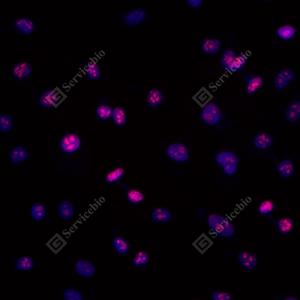 ICC检测Ki67蛋白(货号 GB121141)(红色). 样品: NIH-3T3细胞, 4%多聚甲醛 (货号G1101) 固定20分钟. 封闭: 3% BSA(货号GC305010)的PBS溶液, 室温孵育30分钟. —抗: 1: 100稀释, 4℃ 孵育过夜. 二抗: Cy3标记山羊抗小鼠IgG (H+L) (货号GB21301), 1: 300稀释, 室温孵育1小时. |