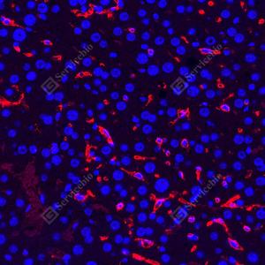 IF检测F4/80蛋白(货号 GB12027)(红色). 样品: 小鼠LPS诱导(24h)肝脏炎症模型, 4%多聚甲醛 (货号G1101) 固定12-24小时. 抗原修复: 柠檬酸抗原修复液(干粉, pH 6.0) (G1201), 高压锅均匀喷气计时2分钟. 封闭: 3% BSA(货号GC305010)的PBS溶液, 室温孵育30分钟. —抗: 1: 1000稀释, 4℃ 孵育过夜. 二抗: Cy3标记山羊抗大鼠IgG (H+L) (货号GB21302), 1: 300稀释, 室温孵育1小时. |
