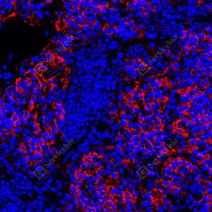 IF检测F4/80蛋白(货号 GB12027)(红色). 样品: 小鼠脾, 4%多聚甲醛 (货号G1101) 固定12-24小时. 抗原修复: 柠檬酸抗原修复液(干粉, pH 6.0) (G1201), 高压锅均匀喷气计时2分钟. 封闭: 3% BSA(货号GC305010)的PBS溶液, 室温孵育30分钟. —抗: 1: 1000稀释, 4℃ 孵育过夜. 二抗: Cy3标记山羊抗大鼠IgG (H+L) (货号GB21302), 1: 300稀释, 室温孵育1小时. |