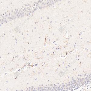 IHC检测F4/80蛋白(货号 GB113373). 样品: 小鼠脑, 4%多聚甲醛 (货号G1101) 固定12-24小时. 抗原修复: 柠檬酸抗原修复液(干粉, pH 6.0) (G1201), 98℃, 20分钟. —抗: 1: 1000稀释, 4℃ 孵育过夜. 二抗: HRP标记山羊抗兔IgG (H+L) (货号GB23303), 1: 200稀释, 室温孵育1小时. |