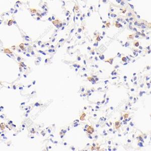 IHC检测F4/80蛋白(货号 GB113373). 样品: 小鼠肺, 4%多聚甲醛 (货号G1101) 固定12-24小时. 抗原修复: 柠檬酸抗原修复液(干粉, pH 6.0) (G1201), 98℃, 20分钟. —抗: 1: 500稀释, 4℃ 孵育过夜. 二抗: HRP标记山羊抗兔IgG (H+L) (货号GB23303), 1: 200稀释, 室温孵育1小时. |
