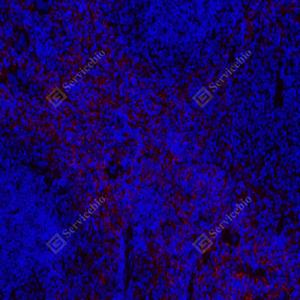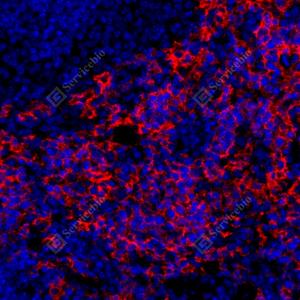 IF检测F4/80蛋白(货号 GB113373)(红色). 样品: 小鼠脾, 4%多聚甲醛 (货号G1101) 固定12-24小时. 抗原修复: Tris-EDTA抗原修复液(pH 9.0) (G1203), 98℃, 20分钟. 封闭: 3% BSA(货号GC305010)的PBS溶液, 室温孵育30分钟. —抗: 1: 600稀释, 4℃ 孵育过夜. 二抗: Cy3标记山羊抗兔IgG (H+L) (货号GB21303), 1: 300稀释, 室温孵育1小时. |