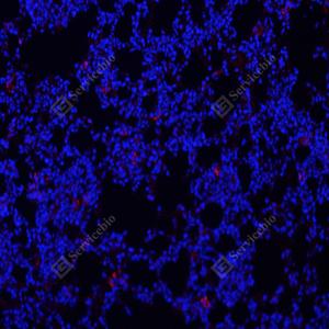 IF检测F4/80蛋白(货号 GB113373)(红色). 样品: 小鼠脂多糖24小时肺, 4%多聚甲醛 (货号G1101) 固定12-24小时. 抗原修复: Tris-EDTA抗原修复液(pH 9.0) (G1203), 98℃, 20分钟. 封闭: 3% BSA(货号GC305010)的PBS溶液, 室温孵育30分钟. —抗: 1: 600稀释, 4℃ 孵育过夜. 二抗: Cy3标记山羊抗兔IgG (H+L) (货号GB21303), 1: 300稀释, 室温孵育1小时. |
