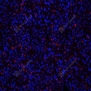 IF检测F4/80蛋白(货号 GB113373)(红色). 样品: 小鼠脂多糖24小时肝脏, 4%多聚甲醛 (货号G1101) 固定12-24小时. 抗原修复: Tris-EDTA抗原修复液(pH 9.0) (G1203), 98℃, 20分钟. 封闭: 3% BSA(货号GC305010)的PBS溶液, 室温孵育30分钟. —抗: 1: 600稀释, 4℃ 孵育过夜. 二抗: Cy3标记山羊抗兔IgG (H+L) (货号GB21303), 1: 300稀释, 室温孵育1小时. |