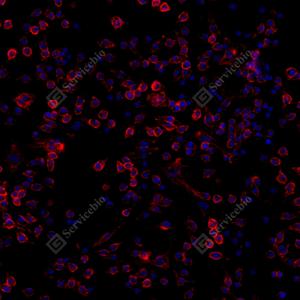 ICC检测F4/80蛋白(货号 GB113373)(红色). 样品: Raw264.7细胞, 4%多聚甲醛 (货号G1101) 固定20分钟. 封闭: 3% BSA(货号GC305010)的PBS溶液, 室温孵育30分钟. —抗: 1: 500稀释, 4℃ 孵育过夜. 二抗: Cy3标记山羊抗兔IgG (H+L) (货号GB21303), 1: 300稀释, 室温孵育1小时. |