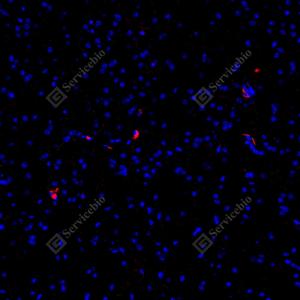 IF检测F4/80蛋白(货号 GB113373)(红色). 样品: 小鼠脑, 4%多聚甲醛 (货号G1101) 固定12-24小时. 抗原修复: Tris-EDTA抗原修复液(pH 9.0) (G1203), 98℃, 20分钟. 封闭: 3% BSA(货号GC305010)的PBS溶液, 室温孵育30分钟. —抗: 1: 500稀释, 4℃ 孵育过夜. 二抗: Cy3标记山羊抗兔IgG (H+L) (货号GB21303), 1: 300稀释, 室温孵育1小时. |