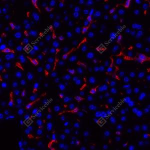 IF检测F4/80蛋白(货号 GB113373)(红色). 样品: 小鼠肝, 4%多聚甲醛 (货号G1101) 固定12-24小时. 抗原修复: Tris-EDTA抗原修复液(pH 9.0) (G1203), 98℃, 20分钟. 封闭: 3% BSA(货号GC305010)的PBS溶液, 室温孵育30分钟. —抗: 1: 500稀释, 4℃ 孵育过夜. 二抗: Cy3标记山羊抗兔IgG (H+L) (货号GB21303), 1: 300稀释, 室温孵育1小时. |