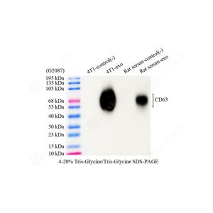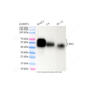 | WB检测CD63蛋白(货号 GB15620). 样品: 经RIPA裂解液(货号G2002)处理的蛋白质. 封闭: 3%脱脂牛奶(货号GC310001)溶于TBST溶液, 室温孵育1小时. —抗: 1: 1000稀释, 4℃ 孵育过夜. 二抗: HRP标记山羊抗兔IgG (H+L) (货号GB23303), 1: 5000稀释, 室温孵育1小时. |