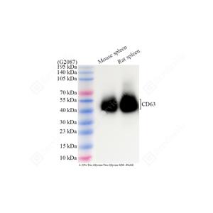 CD63 antigen is a protein is a member of the transmembrane 4 superfamily, also known as the tetraspanin family. Most of these members are cell-surface proteins that are characterized by the presence of four hydrophobic domains. The proteins mediate signal transduction events that play a role in the regulation of cell development, activation, growth, and motility. CD63 is a cell surface glycoprotein that is known to complex with integrins.CD63 is mainly associated with membranes of intracellular vesicles, although cell surface expression may be induced.
