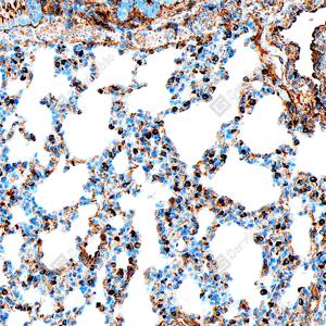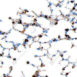 | IHC检测CD63蛋白(货号 GB15620). 样品: 小鼠脂多糖诱导炎症模型(24小时)肺脏, 4%多聚甲醛 (货号G1101) 固定12-24小时. 抗原修复: Tris-EDTA抗原修复液(pH 9.0) (G1203), 98℃, 20分钟. —抗: 1: 900稀释, 4℃ 孵育过夜. 二抗: S-vision免疫组化多聚二抗(山羊抗兔),即用型 (货号G1302), 室温孵育20分钟. |