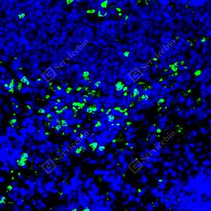 | IF检测 CD63蛋白(货号 GB15620)(绿色). 样品: 小鼠脾, 4%多聚甲醛 (货号G1101) 固定12-24小时. 抗原修复: Tris-EDTA抗原修复液(pH 9.0) (G1203), 98℃, 20分钟. —抗: 1: 900稀释, 4℃ 孵育过夜. 二抗: Alexa Fluor 488标记山羊抗兔IgG (H+L) (货号GB25303), 1: 400稀释, 室温孵育1小时. |