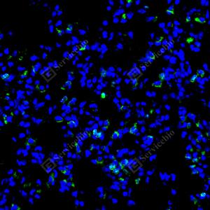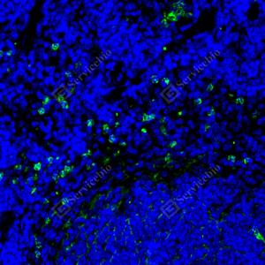| IF检测CD63蛋白(货号 GB15620)(绿色). 样品: 大鼠脾, 4%多聚甲醛 (货号G1101) 固定12-24小时. 抗原修复: Tris-EDTA抗原修复液(pH 9.0) (G1203), 98℃, 20分钟. —抗: 1: 900稀释, 4℃ 孵育过夜. 二抗: Alexa Fluor 488标记山羊抗兔IgG (H+L) (货号GB25303), 1: 400稀释, 室温孵育1小时. |