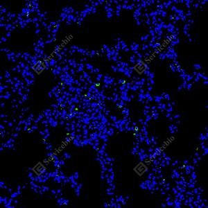 | IF检测 CD63蛋白(货号 GB15620)(绿色). 样品: 小鼠肺, 4%多聚甲醛 (货号G1101) 固定12-24小时. 抗原修复: Tris-EDTA抗原修复液(pH 9.0) (G1203), 98℃, 20分钟. —抗: 1: 2700稀释, 4℃ 孵育过夜. 二抗: Alexa Fluor 488标记山羊抗兔IgG (H+L) (货号GB25303), 1: 400稀释, 室温孵育1小时. |