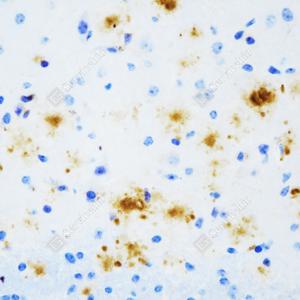 IHC检测beta Amyloid 1-40蛋白(货号 GB151197). 样品: 小鼠脑, 4%多聚甲醛 (货号G1101) 固定12-24小时. 抗原修复: Tris-EDTA抗原修复液(pH 9.0) (G1203), 98℃, 20分钟. —抗: 1: 500稀释, 4℃ 孵育过夜. 二抗: HRP标记山羊抗小鼠IgG (H+L) (货号GB23301), 1: 200稀释, 室温孵育1小时. |