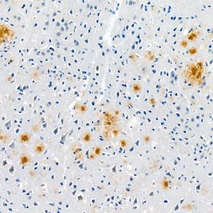 IHC检测beta Amyloid 1-40蛋白(货号 GB111197). 样品: 小鼠脑, 4%多聚甲醛 (货号G1101) 固定12-24小时. 抗原修复: 柠檬酸抗原修复液(干粉, pH 6.0) (G1201), 98℃, 20分钟. —抗: 1: 400稀释, 4℃ 孵育过夜. 二抗: HRP标记山羊抗兔IgG (H+L) (货号GB23303), 1: 200稀释, 室温孵育1小时. |