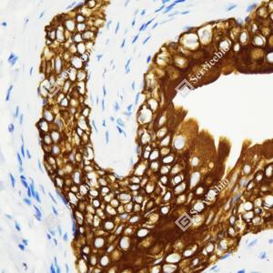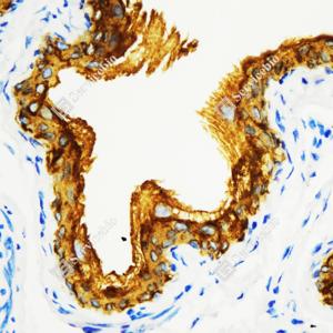 | IHC检测Cytokeratin 7蛋白(货号 GB115696). 样品: 小鼠膀胱, 4%多聚甲醛 (货号G1101) 固定12-24小时. 抗原修复: 柠檬酸抗原修复液(干粉, pH 6.0) (G1201), 98℃, 20分钟. —抗: 1: 1000稀释, 4℃ 孵育过夜. 二抗: HRP标记山羊抗兔IgG (H+L) (货号GB23303), 1: 200稀释, 室温孵育1小时. |