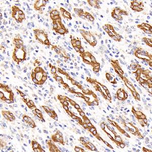 | IHC检测Cytokeratin 7蛋白(货号 GB12225). 样品: 人胃, 4%多聚甲醛 (货号G1101) 固定12-24小时. 抗原修复: 柠檬酸抗原修复液(干粉, pH 6.0) (G1201), 高压锅均匀喷气计时2分钟. —抗: 1: 500稀释, 4℃ 孵育过夜. 二抗: HRP标记山羊抗小鼠IgG (H+L) (货号GB23301), 1: 200稀释, 室温孵育1小时. |
