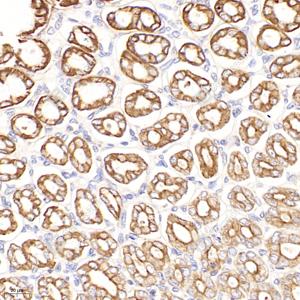 | IHC检测Cytokeratin 7蛋白(货号 GB12225). 样品: 大鼠胃, 4%多聚甲醛 (货号G1101) 固定12-24小时. 抗原修复: 柠檬酸抗原修复液(干粉, pH 6.0) (G1201), 高压锅均匀喷气计时2分钟. —抗: 1: 500稀释, 4℃ 孵育过夜. 二抗: HRP标记山羊抗小鼠IgG (H+L) (货号GB23301), 1: 200稀释, 室温孵育1小时. |