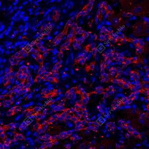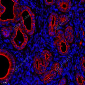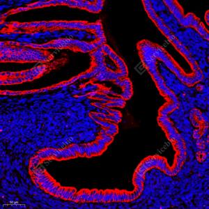 | IF检测Cytokeratin 7蛋白(货号 GB12225)(红色). 样品: 小鼠子宫, 4%多聚甲醛 (货号G1101) 固定12-24小时. 抗原修复: 柠檬酸抗原修复液(干粉, pH 6.0) (G1201), 高压锅均匀喷气计时2分钟. 封闭: 3% BSA(货号GC305010)的PBS溶液, 室温孵育30分钟. —抗: 1: 100稀释, 4℃ 孵育过夜. 二抗: Cy3标记山羊抗小鼠IgG (H+L) (货号GB21301), 1: 300稀释, 室温孵育1小时. |