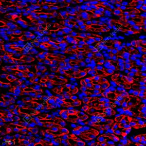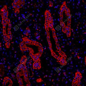 | IF检测Cytokeratin 7蛋白(货号 GB12225)(红色). 样品: 人肾, 4%多聚甲醛 (货号G1101) 固定12-24小时. 抗原修复: 柠檬酸抗原修复液(干粉, pH 6.0) (G1201), 高压锅均匀喷气计时2分钟. 封闭: 3% BSA(货号GC305010)的PBS溶液, 室温孵育30分钟. —抗: 1: 200稀释, 4℃ 孵育过夜. 二抗: Cy3标记山羊抗小鼠IgG (H+L) (货号GB21301), 1: 300稀释, 室温孵育1小时. |