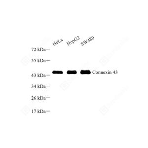 WB检测Connexin 43/GJA1蛋白(货号 GB11234). 样品: 经RIPA裂解液(货号G2002)处理的蛋白质. 封闭: 3%脱脂牛奶(货号GC310001)溶于TBST溶液, 室温孵育1小时. —抗: 1: 1000稀释, 4℃ 孵育过夜. 二抗: HRP标记山羊抗兔IgG (H+L) (货号GB23303), 1: 5000稀释, 室温孵育1小时. |