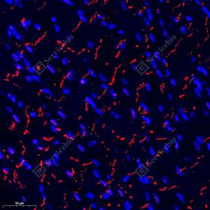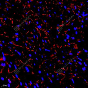 IF检测Connexin 43/GJA1蛋白(货号 GB11234)(红色). 样品: 小鼠心, 4%多聚甲醛 (货号G1101) 固定12-24小时. 抗原修复: Tris-EDTA抗原修复液(pH 9.0) (G1203), 98℃, 20分钟. 封闭: 3% BSA(货号GC305010)的PBS溶液, 室温孵育30分钟. —抗: 1: 100稀释, 4℃ 孵育过夜. 二抗: Cy3标记山羊抗兔IgG (H+L) (货号GB21303), 1: 300稀释, 室温孵育1小时. |