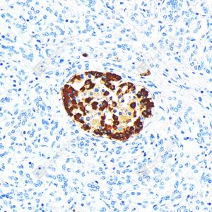 IHC检测Glucagon蛋白(货号 GB15082). 样品: 大鼠胰腺, 4%多聚甲醛 (货号G1101) 固定12-24小时. 抗原修复: 柠檬酸抗原修复液(干粉, pH 6.0) (G1201), 高压锅均匀喷气计时2分钟. —抗: 1: 1000稀释, 4℃ 孵育过夜. 二抗: HRP标记山羊抗小鼠IgG (H+L) (货号GB23301), 1: 200稀释, 室温孵育1小时. |