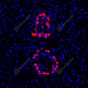 IF检测Glucagon蛋白(货号 GB15082)(红色). 样品: 人胰腺, 4%多聚甲醛 (货号G1101) 固定12-24小时. 抗原修复: 柠檬酸抗原修复液(干粉, pH 6.0) (G1201), 高压锅均匀喷气计时2分钟. 封闭: 3% BSA(货号GC305010)的PBS溶液, 室温孵育30分钟. —抗: 1: 500稀释, 4℃ 孵育过夜. 二抗: Cy3标记山羊抗小鼠IgG (H+L) (货号GB21301), 1: 300稀释, 室温孵育1小时. |