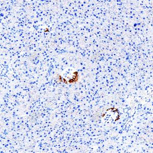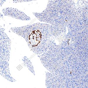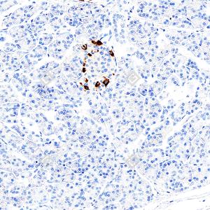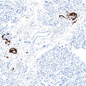 | IHC检测Glucagon蛋白(货号 GB153496). 样品: 人胰腺, 4%多聚甲醛 (货号G1101) 固定12-24小时. 抗原修复: Tris-EDTA抗原修复液(pH 9.0) (G1203), 100℃, 25分钟. —抗: 1: 500稀释, 4℃ 孵育过夜. 二抗: S-vision免疫组化多聚二抗(山羊抗兔),即用型 (货号G1302), 室温孵育20分钟. |