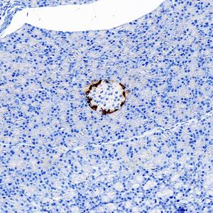 | IHC检测Glucagon蛋白(货号 GB153496). 样品: 小鼠胰腺, 4%多聚甲醛 (货号G1101) 固定12-24小时. 抗原修复: Tris-EDTA抗原修复液(pH 9.0) (G1203), 100℃, 25分钟. —抗: 1: 500稀释, 4℃ 孵育过夜. 二抗: S-vision免疫组化多聚二抗(山羊抗兔),即用型 (货号G1302), 室温孵育20分钟. |
