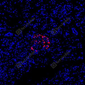 | IF检测Glucagon蛋白(货号 GB153496)(红色). 样品: 大鼠胰腺, 4%多聚甲醛 (货号G1101) 固定12-24小时. 抗原修复: Tris-EDTA抗原修复液(pH 9.0) (G1203), 100℃, 25分钟. 封闭: 3% BSA(货号GC305010)的PBS溶液, 室温孵育30分钟. —抗: 1: 500稀释, 4℃ 孵育过夜. 二抗: Cy3标记山羊抗兔IgG (H+L) (货号GB21303), 1: 300稀释, 室温孵育1小时. |