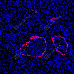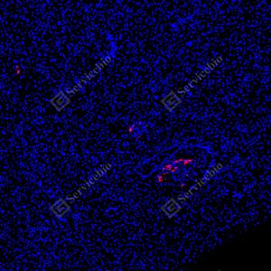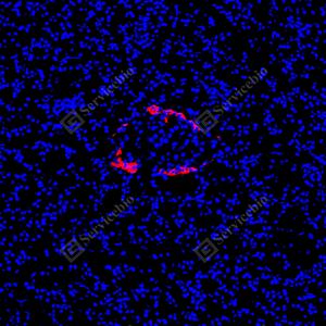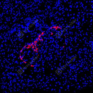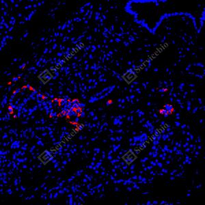| IF检测Glucagon蛋白(货号 GB153496)(红色). 样品: 小鼠胰腺, 4%多聚甲醛 (货号G1101) 固定12-24小时. 抗原修复: Tris-EDTA抗原修复液(pH 9.0) (G1203), 100℃, 25分钟. 封闭: 3% BSA(货号GC305010)的PBS溶液, 室温孵育30分钟. —抗: 1: 500稀释, 4℃ 孵育过夜. 二抗: Cy3标记山羊抗兔IgG (H+L) (货号GB21303), 1: 300稀释, 室温孵育1小时. |