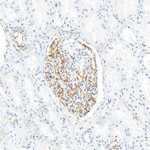 IHC检测Nestin蛋白(货号 GB115685). 样品: 人肾, 4%多聚甲醛 (货号G1101) 固定12-24小时. 抗原修复: 柠檬酸抗原修复液(干粉, pH 6.0) (G1201), 98℃, 20分钟. —抗: 1: 500稀释, 4℃ 孵育过夜. 二抗: HRP标记山羊抗兔IgG (H+L) (货号GB23303), 1: 200稀释, 室温孵育1小时. |