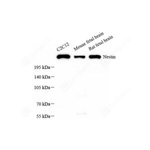 | WB检测Nestin蛋白(货号 GB12160). 样品: 经RIPA裂解液(货号G2002)处理的蛋白质. 封闭: 3%脱脂牛奶(货号GC310001)溶于TBST溶液, 室温孵育1小时. —抗: 1: 1000稀释, 4℃ 孵育过夜. 二抗: HRP标记山羊抗小鼠IgG (H+L) (货号GB23301), 1: 5000稀释, 室温孵育1小时. |
