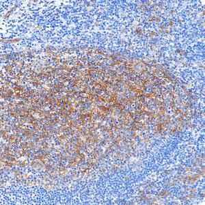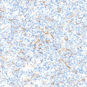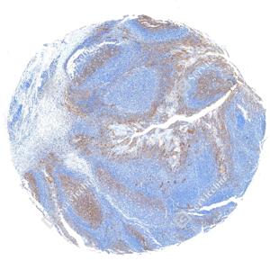 | IHC检测ICAM1蛋白(货号 GB150141). 样品: 人扁桃体, 4%多聚甲醛 (货号G1101) 固定12-24小时. 抗原修复: 抗原修复仪 (货号 ARI-4),Tris-EDTA抗原修复液(pH 9.0) (货号G1203), 水浴100℃, 25分钟. —抗: 1: 1000稀释, 4℃ 孵育过夜. 二抗: S-vision免疫组化多聚二抗(山羊抗小鼠), 即用型(货号G1301), 室温孵育20分钟. |