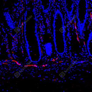 | IF检测ICAM1蛋白(货号 GB150141)(红色). 样品: 人结肠, 4%多聚甲醛 (货号G1101) 固定12-24小时. 抗原修复: 抗原修复仪 (货号 ARI-4),Tris-EDTA抗原修复液(pH 9.0) (货号G1203), 水浴100℃, 25分钟. 封闭: 3% BSA(货号GC305010)的PBS溶液, 室温孵育30分钟. —抗: 1: 1500稀释, 4℃ 孵育过夜. 二抗: Cy3标记山羊抗小鼠IgG (H+L) (货号GB21301), 1: 300稀释, 室温孵育1小时. |