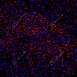 | IF检测ICAM1蛋白(货号 GB150141)(红色). 样品: 人肝, 4%多聚甲醛 (货号G1101) 固定12-24小时. 抗原修复: 抗原修复仪 (货号 ARI-4),Tris-EDTA抗原修复液(pH 9.0) (货号G1203), 水浴100℃, 25分钟. 封闭: 3% BSA(货号GC305010)的PBS溶液, 室温孵育30分钟. —抗: 1: 1500稀释, 4℃ 孵育过夜. 二抗: Cy3标记山羊抗小鼠IgG (H+L) (货号GB21301), 1: 300稀释, 室温孵育1小时. |