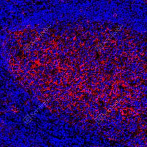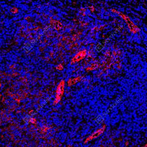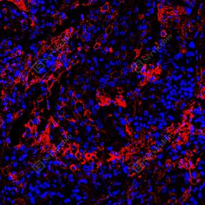 | IF检测ICAM1蛋白(货号 GB150141)(红色). 样品: 人扁桃体, 4%多聚甲醛 (货号G1101) 固定12-24小时. 抗原修复: 抗原修复仪 (货号 ARI-4),Tris-EDTA抗原修复液(pH 9.0) (货号G1203), 水浴100℃, 25分钟. 封闭: 3% BSA(货号GC305010)的PBS溶液, 室温孵育30分钟. —抗: 1: 1500稀释, 4℃ 孵育过夜. 二抗: Cy3标记山羊抗小鼠IgG (H+L) (货号GB21301), 1: 300稀释, 室温孵育1小时. |