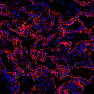 | IF检测ICAM1蛋白(货号 GB150141)(红色). 样品: 人肺, 4%多聚甲醛 (货号G1101) 固定12-24小时. 抗原修复: 抗原修复仪 (货号 ARI-4),Tris-EDTA抗原修复液(pH 9.0) (货号G1203), 水浴100℃, 25分钟. 封闭: 3% BSA(货号GC305010)的PBS溶液, 室温孵育30分钟. —抗: 1: 1500稀释, 4℃ 孵育过夜. 二抗: Cy3标记山羊抗小鼠IgG (H+L) (货号GB21301), 1: 300稀释, 室温孵育1小时. |