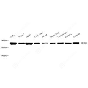 WB检测Hsp60蛋白(货号 GB15243). 样品: 经RIPA裂解液(货号G2002)处理的蛋白质. 封闭: 3%脱脂牛奶(货号GC310001)溶于TBST溶液, 室温孵育1小时. —抗: 1: 500稀释, 4℃ 孵育过夜. 二抗: HRP标记山羊抗小鼠IgG (H+L) (货号GB23301), 1: 5000稀释, 室温孵育1小时. |
