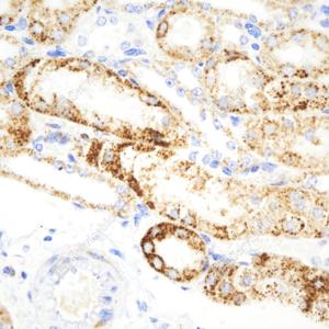 IHC检测Hsp60蛋白(货号 GB15243). 样品: 大鼠肾, 4%多聚甲醛 (货号G1101) 固定12-24小时. 抗原修复: 柠檬酸抗原修复液(干粉, pH 6.0) (G1201), 高压锅均匀喷气计时2分钟. —抗: 1: 500稀释, 4℃ 孵育过夜. 二抗: HRP标记山羊抗小鼠IgG (H+L) (货号GB23301), 1: 200稀释, 室温孵育1小时. |