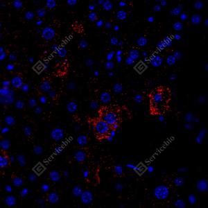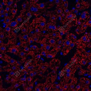 IF检测Hsp60蛋白(货号 GB15243)(红色). 样品: 小鼠肝, 4%多聚甲醛 (货号G1101) 固定12-24小时. 抗原修复: 柠檬酸抗原修复液(干粉, pH 6.0) (G1201), 高压锅均匀喷气计时2分钟. 封闭: 3% BSA(货号GC305010)的PBS溶液, 室温孵育30分钟. —抗: 1: 500稀释, 4℃ 孵育过夜. 二抗: Cy3标记山羊抗小鼠IgG (H+L) (货号GB21301), 1: 300稀释, 室温孵育1小时. |