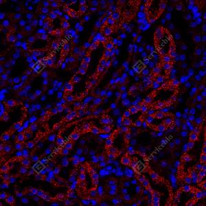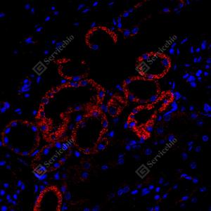 IF检测Hsp60蛋白(货号 GB15243)(红色). 样品: 小鼠肾, 4%多聚甲醛 (货号G1101) 固定12-24小时. 抗原修复: 柠檬酸抗原修复液(干粉, pH 6.0) (G1201), 高压锅均匀喷气计时2分钟. 封闭: 3% BSA(货号GC305010)的PBS溶液, 室温孵育30分钟. —抗: 1: 500稀释, 4℃ 孵育过夜. 二抗: Cy3标记山羊抗小鼠IgG (H+L) (货号GB21301), 1: 300稀释, 室温孵育1小时. |