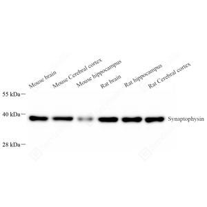 WB检测synaptophysin蛋白(货号 GB15553). 样品: 经RIPA裂解液(货号G2002)处理的蛋白质. 封闭: 3%脱脂牛奶(货号GC310001)溶于TBST溶液, 室温孵育1小时. —抗: 1: 1000稀释, 4℃ 孵育过夜. 二抗: HRP标记山羊抗小鼠IgG (H+L) (货号GB23301), 1: 5000稀释, 室温孵育1小时. |
