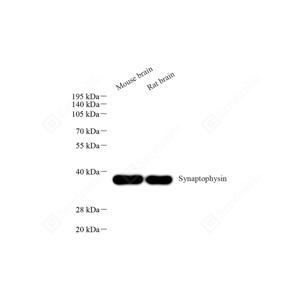 WB检测Synaptophysin蛋白(货号 GB15814). 样品: 经RIPA裂解液(货号G2002)处理的蛋白质. 封闭: 3%脱脂牛奶(货号GC310001)溶于TBST溶液, 室温孵育1小时. —抗: 1: 500稀释, 4℃ 孵育过夜. 二抗: HRP标记山羊抗兔IgG (H+L) (货号GB23303), 1: 5000稀释, 室温孵育1小时. |