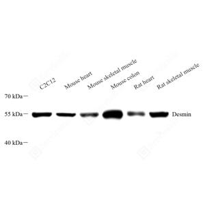 WB检测Desmin蛋白(货号 GB12088). 样品: 经RIPA裂解液(货号G2002)处理的蛋白质. 封闭: 3%脱脂牛奶(货号GC310001)溶于TBST溶液, 室温孵育1小时. —抗: 1: 1000稀释, 4℃ 孵育过夜. 二抗: HRP标记山羊抗小鼠IgG (H+L) (货号GB23301), 1: 5000稀释, 室温孵育1小时. |