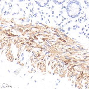 IHC检测Desmin蛋白(货号 GB12088). 样品: 人结肠, 4%多聚甲醛 (货号G1101) 固定12-24小时. 抗原修复: 柠檬酸抗原修复液(干粉, pH 6.0) (G1201), 高压锅均匀喷气计时2分钟. —抗: 1: 1000稀释, 4℃ 孵育过夜. 二抗: HRP标记山羊抗小鼠IgG (H+L) (货号GB23301), 1: 200稀释, 室温孵育1小时. |