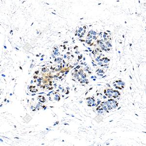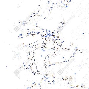 | IHC检测YAP1蛋白(货号 GB153975). 样品: 人乳腺癌, 4%多聚甲醛 (货号G1101) 固定12-24小时. 抗原修复: Tris-EDTA抗原修复液(pH 9.0) (G1203), 100℃, 25分钟. —抗: 1: 3000稀释, 4℃ 孵育过夜. 二抗: S-vision免疫组化多聚二抗(山羊抗兔),即用型 (货号G1302), 室温孵育20分钟. |